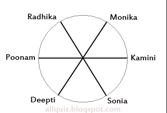6) Six girls are sitting in a circle. Sonia is sitting opposite to Radhika. Poonam is sitting right of Radhika but left of Deepti. Monika is sitting left of Radhika. Kamini is sitting right of Sonia and left of Monika. Now Deepti and Kamini , Monika and Radhika mutually exchange their positions. Based on this information Who will be opposite to Sonia?Explanation: See explanation of question 4